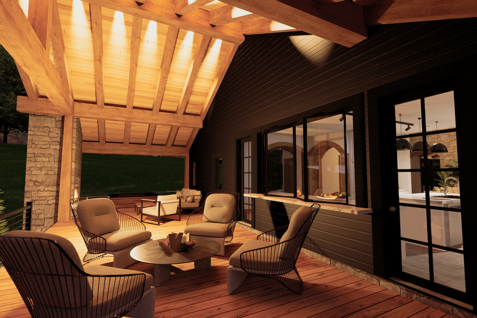 Covered porch with cathedral truss ceiling and corner fireplace facing Ski Windham views and surrounding wilderness